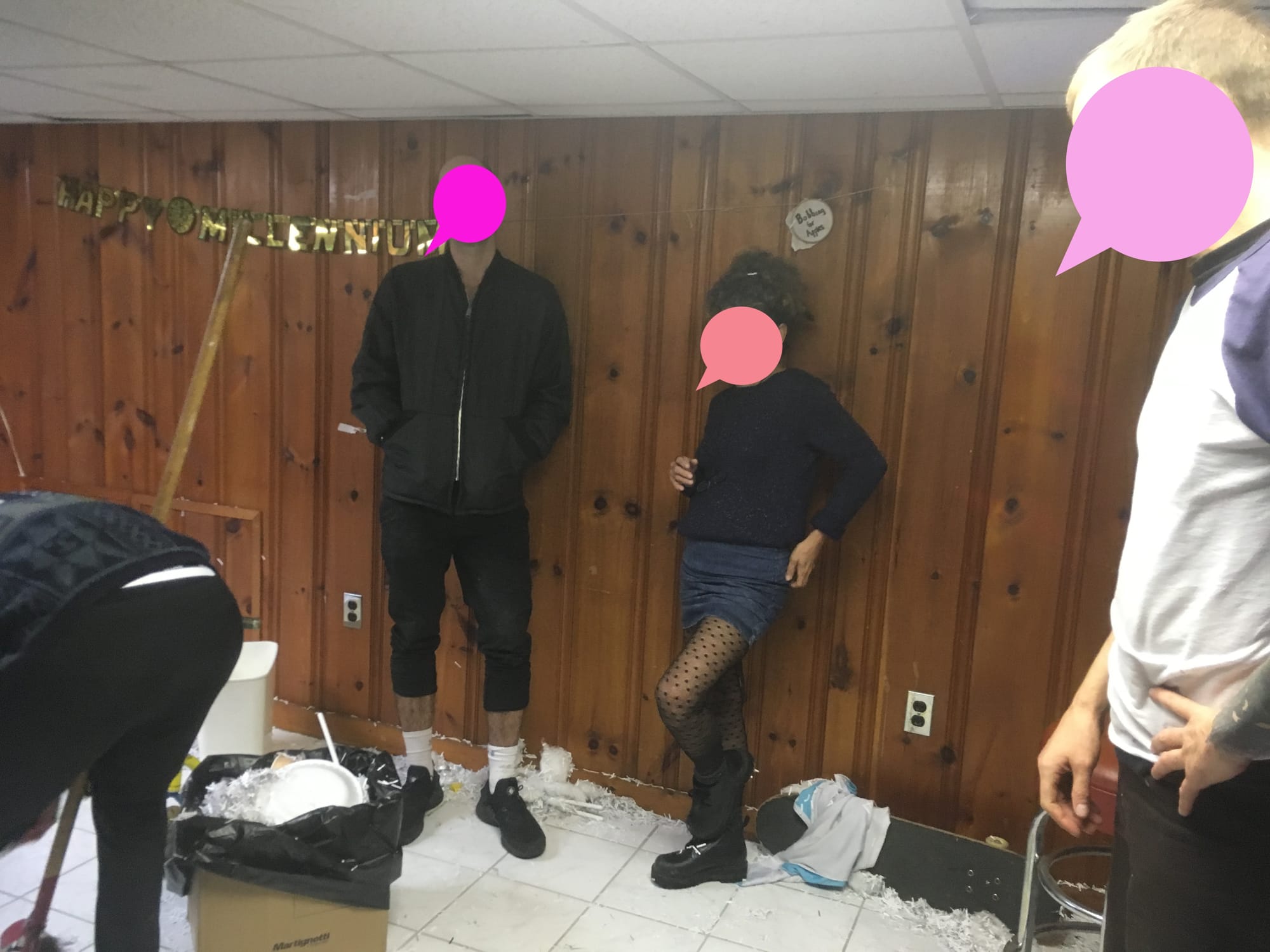 Children's Friend therapy shredded paper, wheelchairs, crutches, leaf blower, champagne, tub of grapes, escape ladder, wood paneling