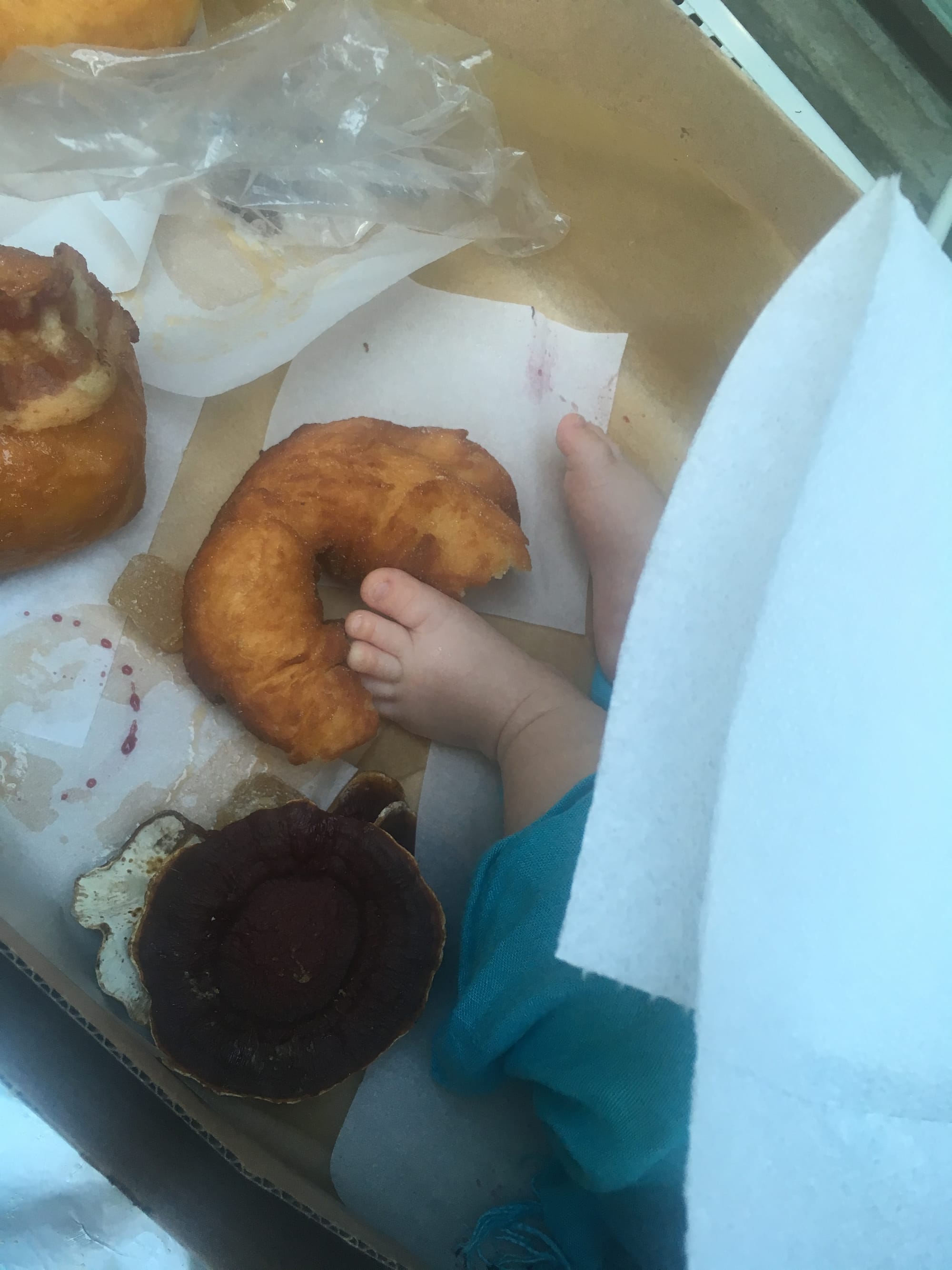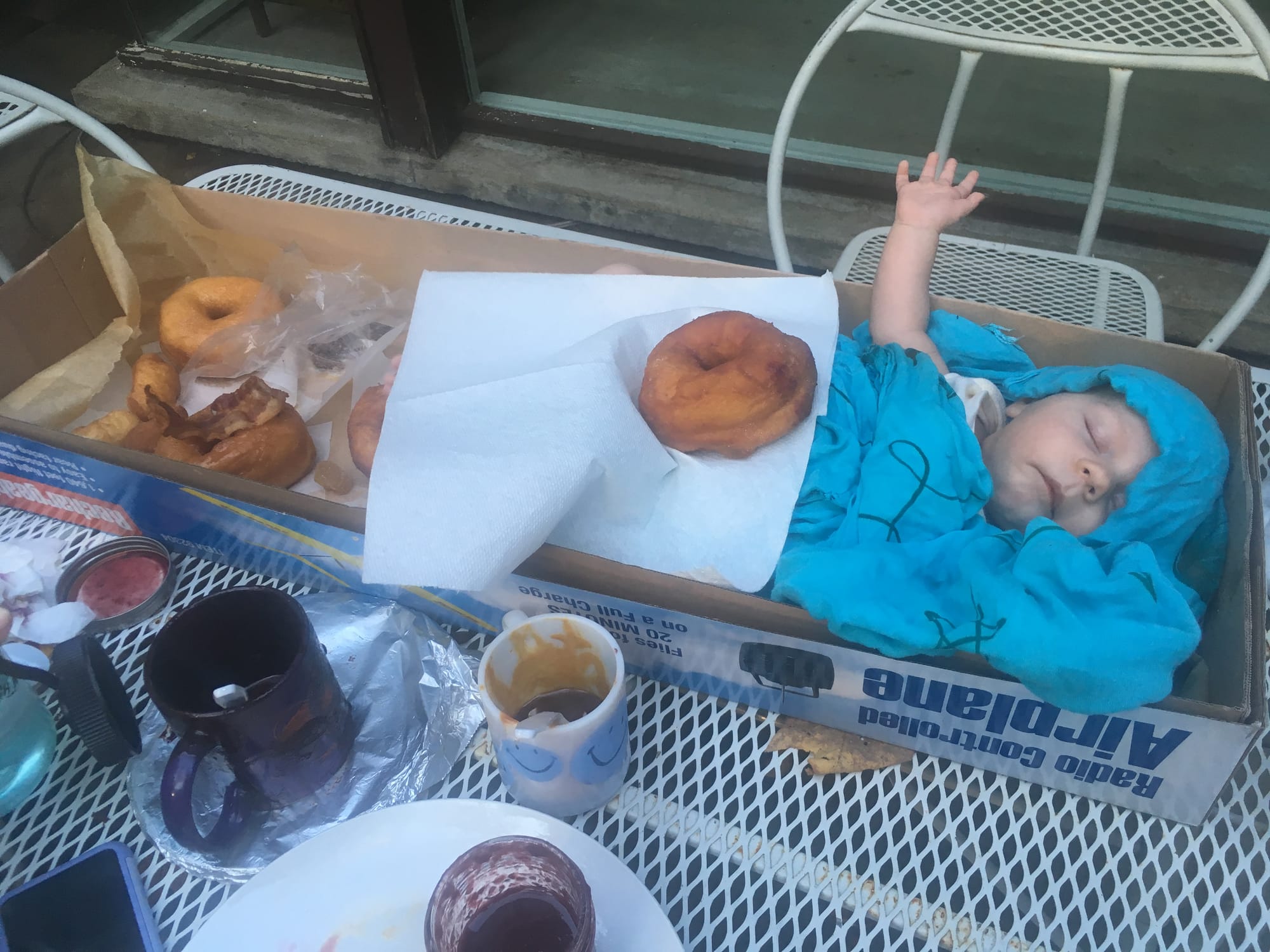 Installation view, MA, Custom fitted box for baby. Cardboard, electronic plane, oil, flour, blueberries, maple syrup, caramel, baby, scarf